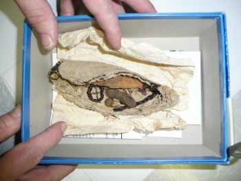 eingewickelter Leinensack mit geflochtenen Haaren, Überresten