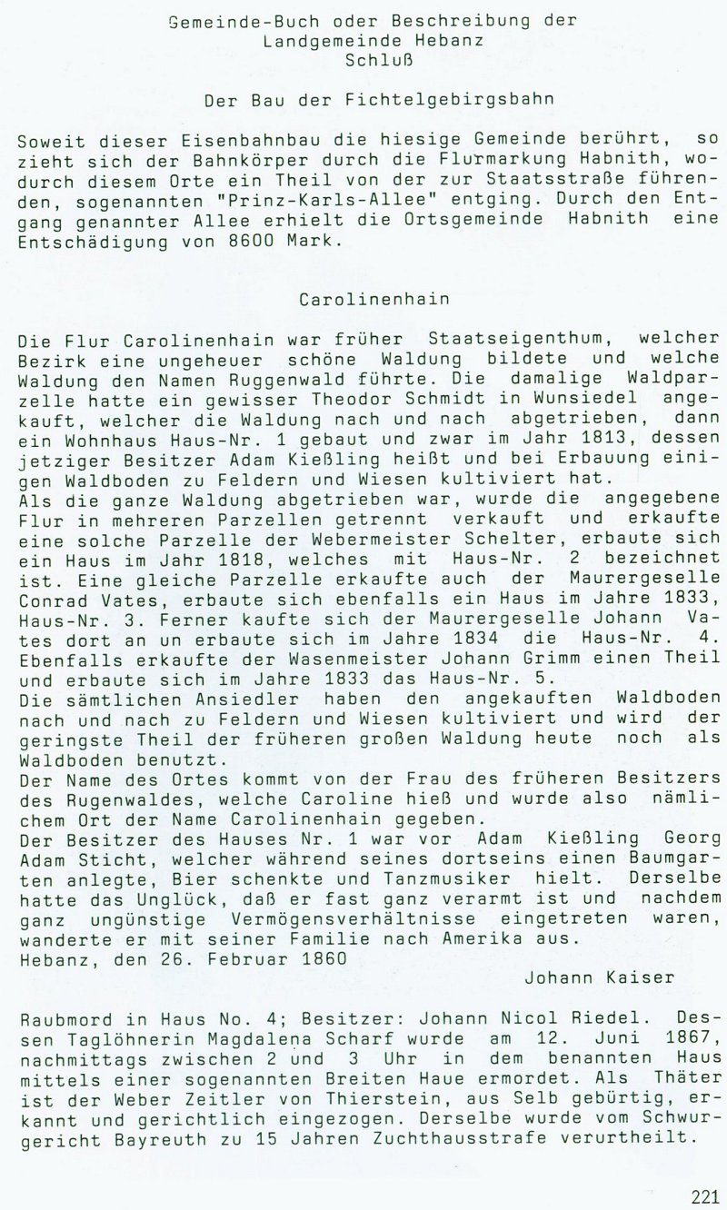 Beschreibung der Landgemeinde Hebanz - Fichtelgebirgsbahn, Karolinenhain (Schluss)